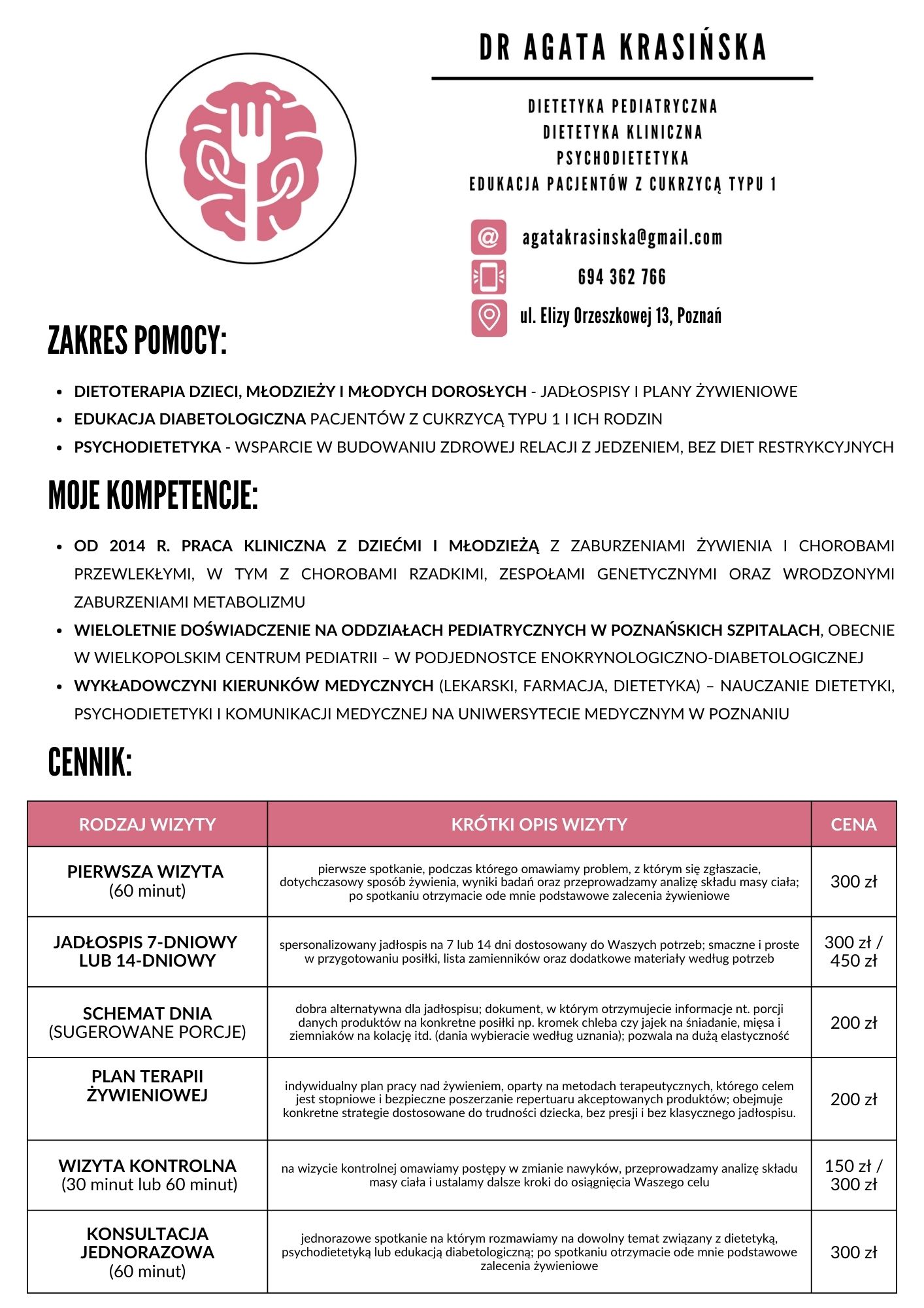 Pracuję stacjonarnie w gabinecie w Poznaniu lub online. Jeśli masz jakiekolwiek pytania dotyczące żywienia dzieci i młodzieży, zapraszam do kontaktu. Chętnie pomogę!